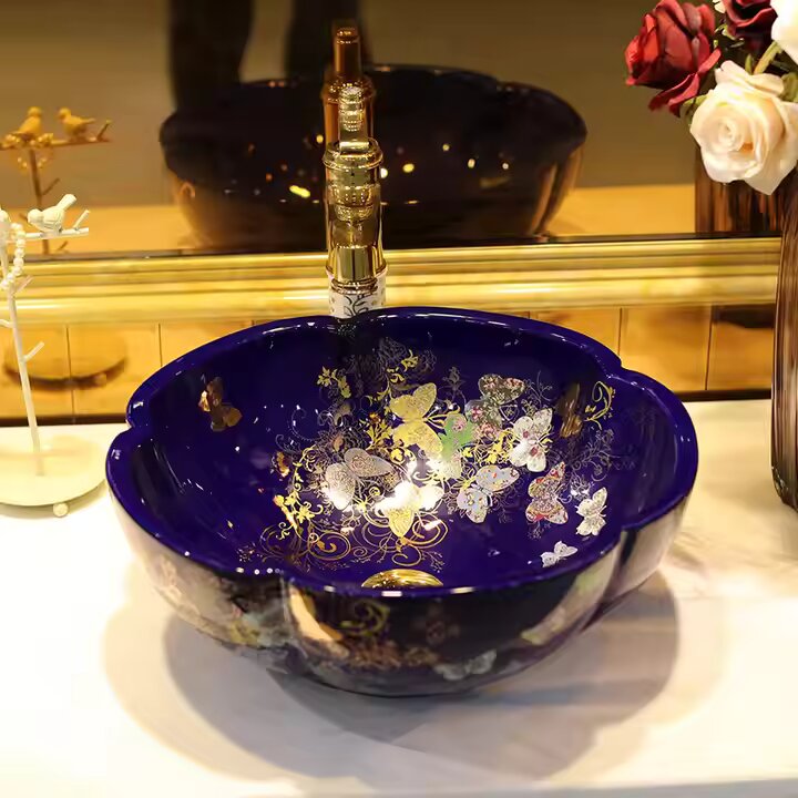 Butterfly Design Ceramic Art Wash Basin - Black & Blue
