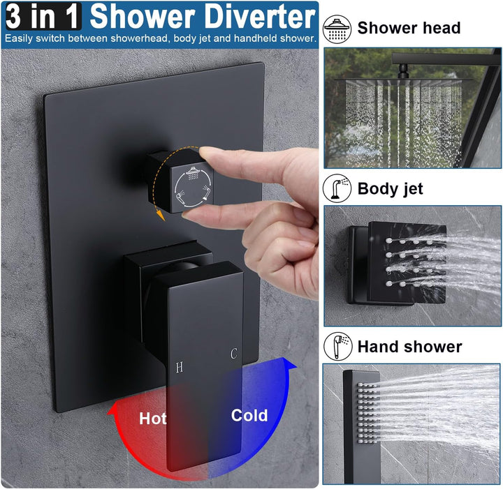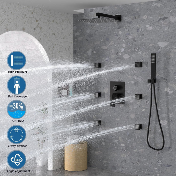 Shower System with Body Jets, 12 Inch Wall Mount Rainfall Shower System and Handheld Body Spray Shower Faucets sets Combo with Rough-in Valve, Matte Black