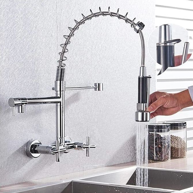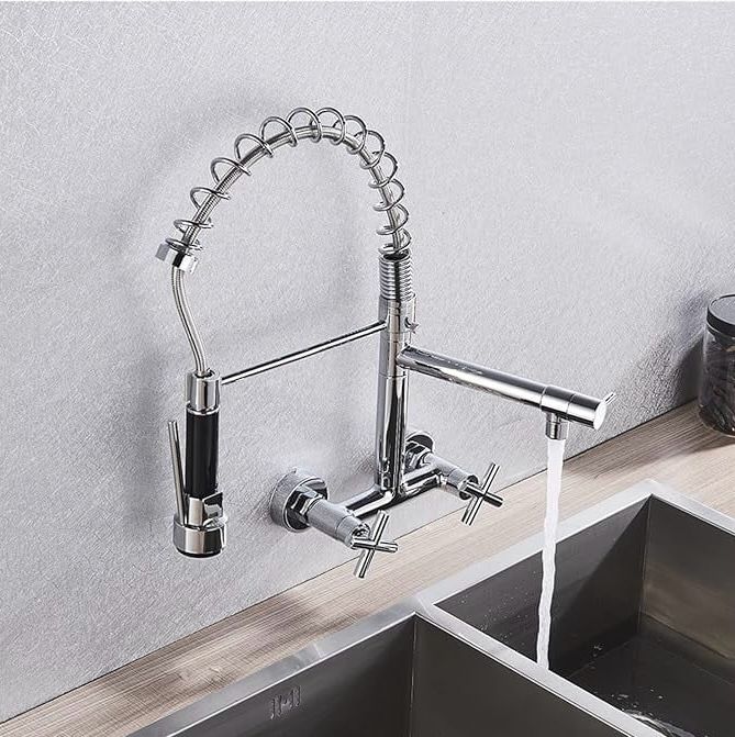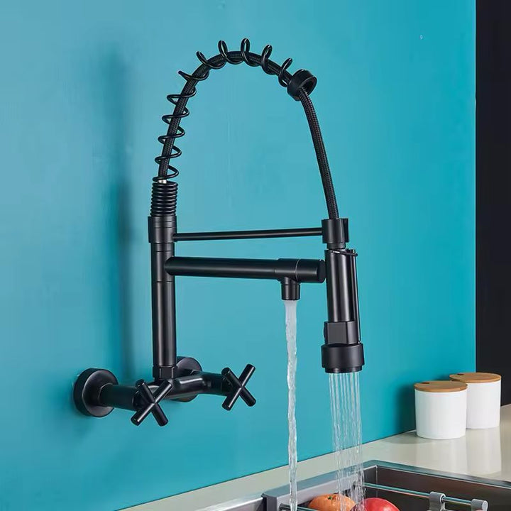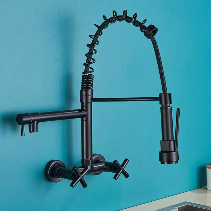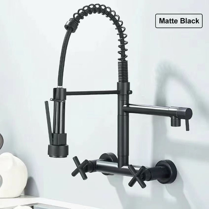 Upgrade your kitchen with this versatile wall-mounted pull-down faucet featuring dual swivel spouts and a sleek, modern design.