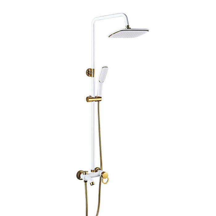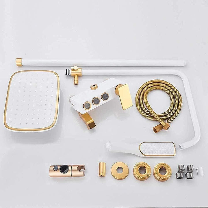 Experience luxury with this White Gold & Matte Black 4-function rainfall shower system, designed for a modern and elegant bathroom upgrade.